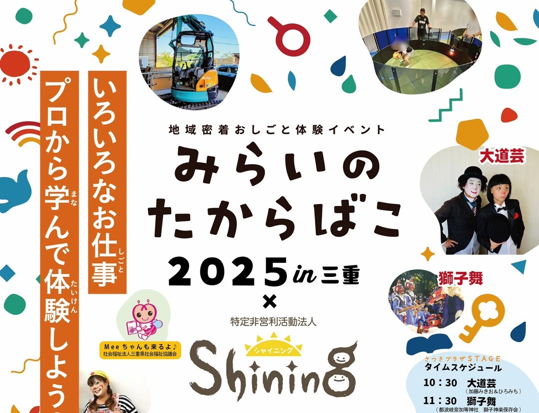 第2回目となる「みらいのたからばこ2025in三重 ×shining」も、地元・三重の企業やプロフェッショナルたちが集結し、こどもたちの「やってみたい!」「知りたい!」に応える、ワクワクの1日をお届けします。