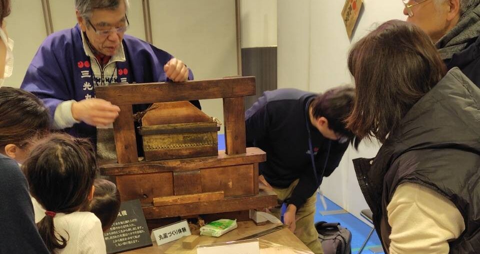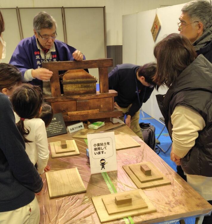 小麦粘土を使い、明治時代の製丸機で丸薬づくりを体験できるおしごと体験です。